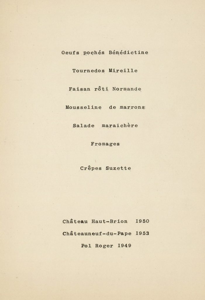Each place setting included a charger (a larger plate underneath), a dinner plate, and a matching bread plate. Silver plated cutlery from Cristofle’s was composed of two knives and two forks per plate. And for a meal certain to include a lot of drinking, each guest had four Cristal d’Arques glasses presented in a diamond pattern – for water, red wine, white wine and champagne.