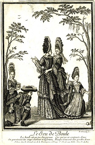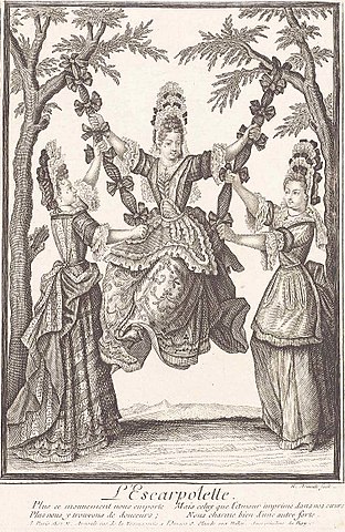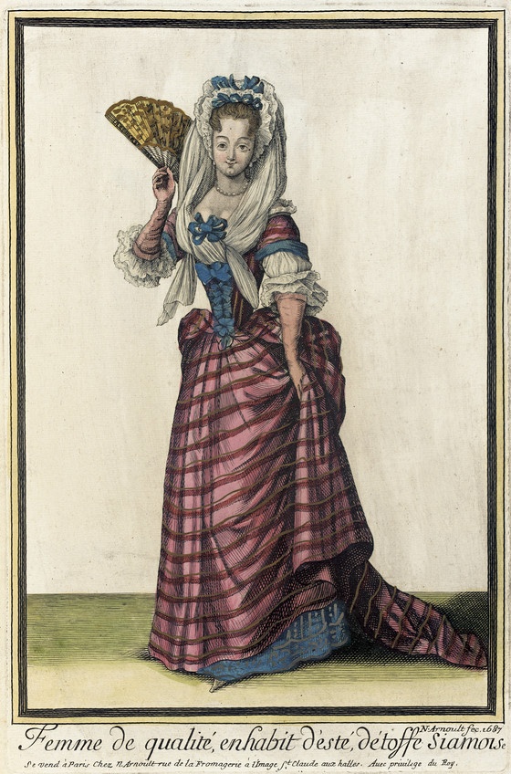 Artist Nicolas Arnoult became well known for his fashion plates, engraved in the late 17th century. His ‘models’ were illustrated walking or sitting on benches in the Tuileries Gardens, à sa toilette, playing billiards, and in all seasons.