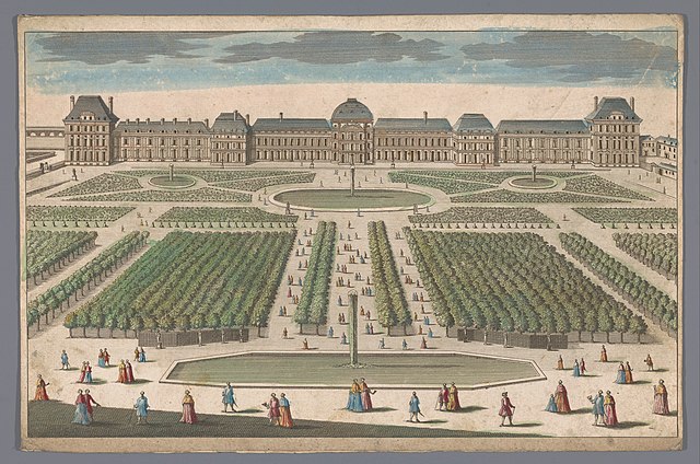 But it was the re-imagining of the gorgeous gardens of the Tuileries by Andre Lenôtre, famous for his landscaping at Versailles, that allowed the latest styles to be showcased, a modern form of advertising. Noble ladies (and men) in French made silks and taffetas, feet enclosed in dainty be-ribboned slippers, strolled and smelled the roses along the wide paths, and rested on newly installed wooden benches. The nouveau riche who had mostly made their fortunes in property dealing and financing war loans from the state, followed the latest fashions, which were copied by anyone of the lower classes who had the money to wear fancy clothes or to add lace to their outfit.