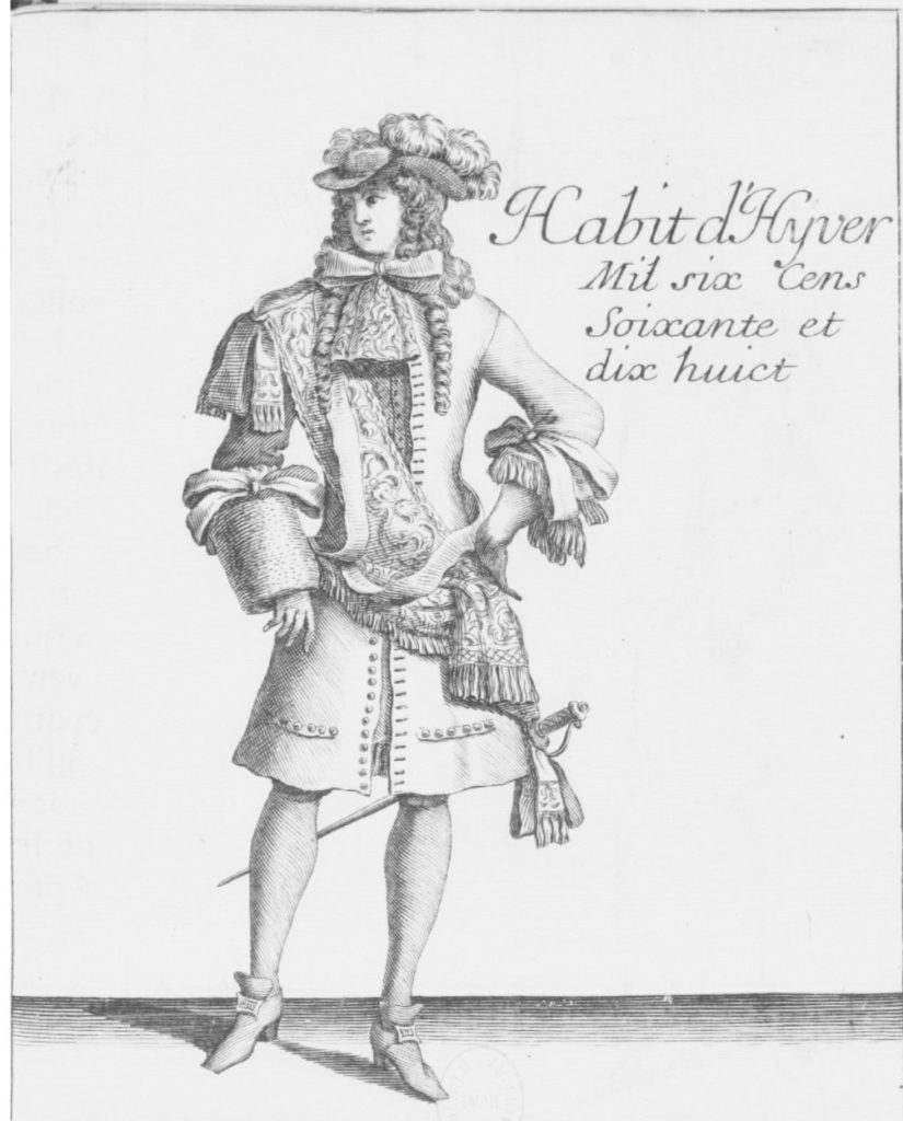 According to Nemeitz, a (male) visitor to Paris must acquire three habits, or formal outfits. These are a simple habit, a black habit, and a habit chamarré. The simple costume is to be a tightly fitted vest and culotte of the same fabric and colour and without embroidery or silver. The last outfit, the habit chamarré , which meant highly decorated or ornamented clothing, was necessary just in case one would be ‘presented at Court’.