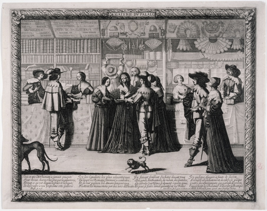 In the previous century, wealthy Parisians bargained for fabrics and books at the upmarket Galerie du Palais, located on each side of the walkway leading to the Great Room at the Palais de Justice on Île de la Cité. A fire destroyed its wooden stalls in 1618 and in its place was built an elegant Renaissance structure. It was an early blueprint of a department store, first of all being indoors rather than an open-air market. Spacious counters showcased each merchant’s goods, and men and women both bought and sold whilst they mingled in the aisles and compared products and prices.