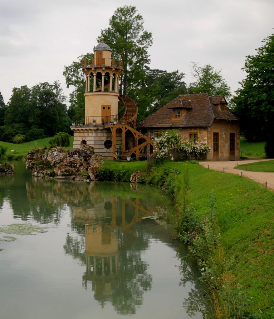 Marie Antoinette’s Temple of Love was not her only folly – follies were very popular in the eighteenth century. There is the Belvedere, also in the English garden, where she took her breakfast, played music and sought comfort on hot days when all the doors were opened for any cool breeze to waft through. Perhaps more famous is her folly in the Queen’s Hameau, the medieval style farm and village she had built on the Trianon Estate, the Marlborough Tower which perches on the edge of the man-made lake. Of this Tower, Madame de Campan wrote: “the exterior stair, bordered with stocks and geraniums, seemed like a garden in the air”.