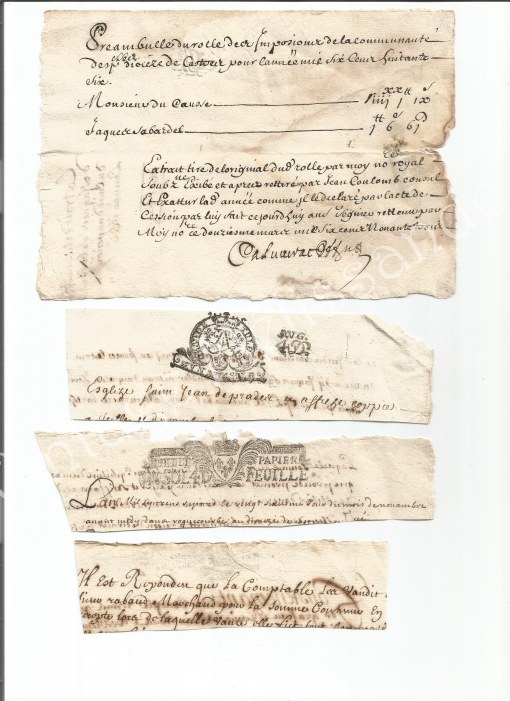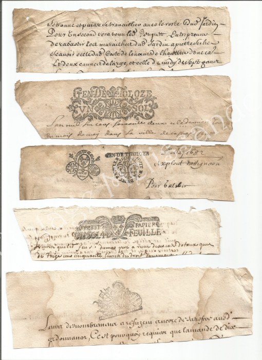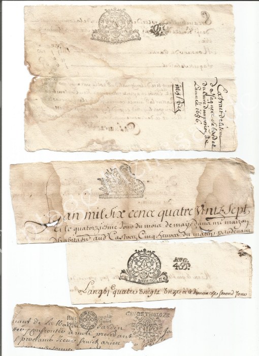 A very rare digital collection of handwritten paper fragments and inked cachets from the 1600s in France.
