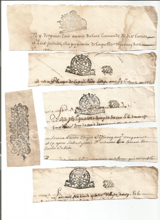 These inked stamps and pieces of paper, originally on parchment, have been removed some time in the past from French notary or legal documents, such as sale or marriage contracts or invoices. All include beautiful handwriting.