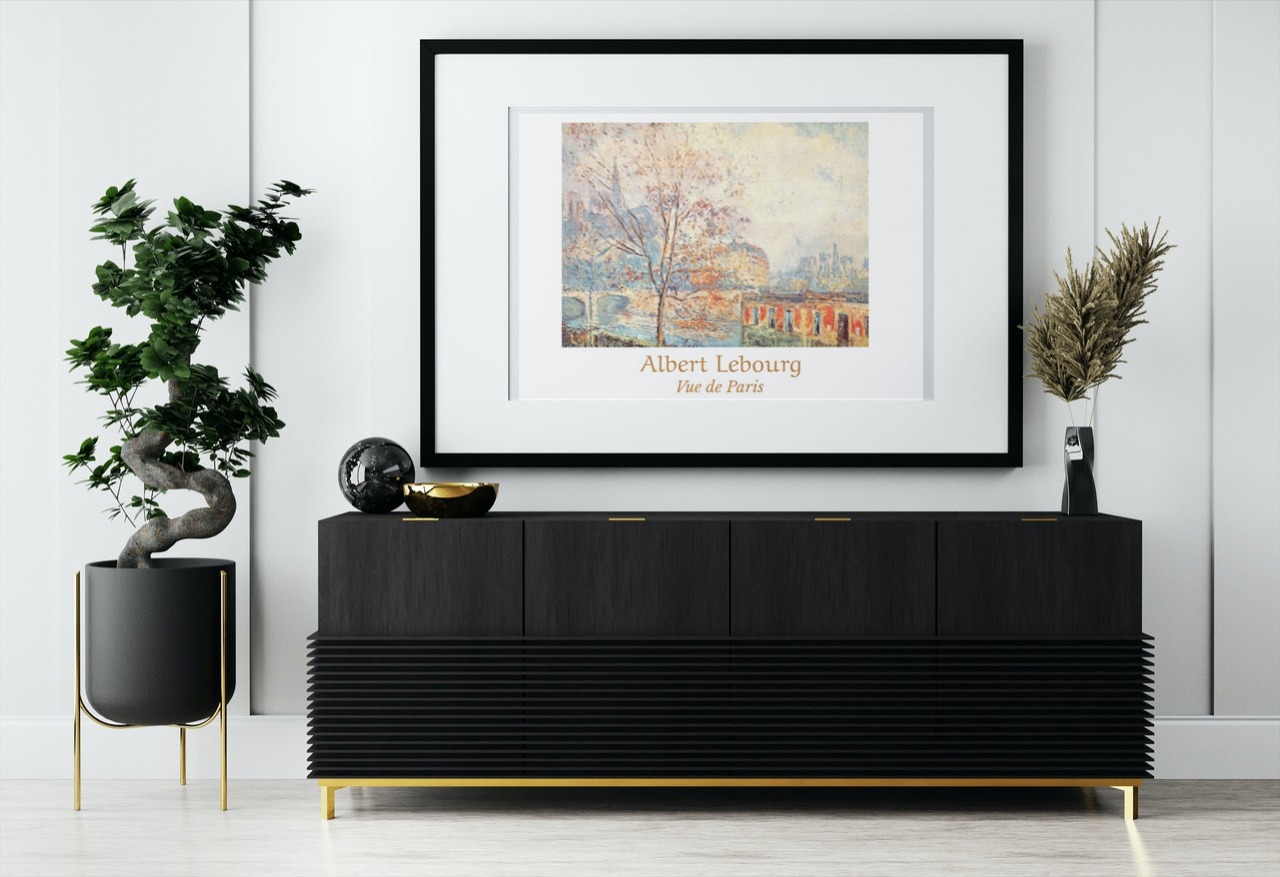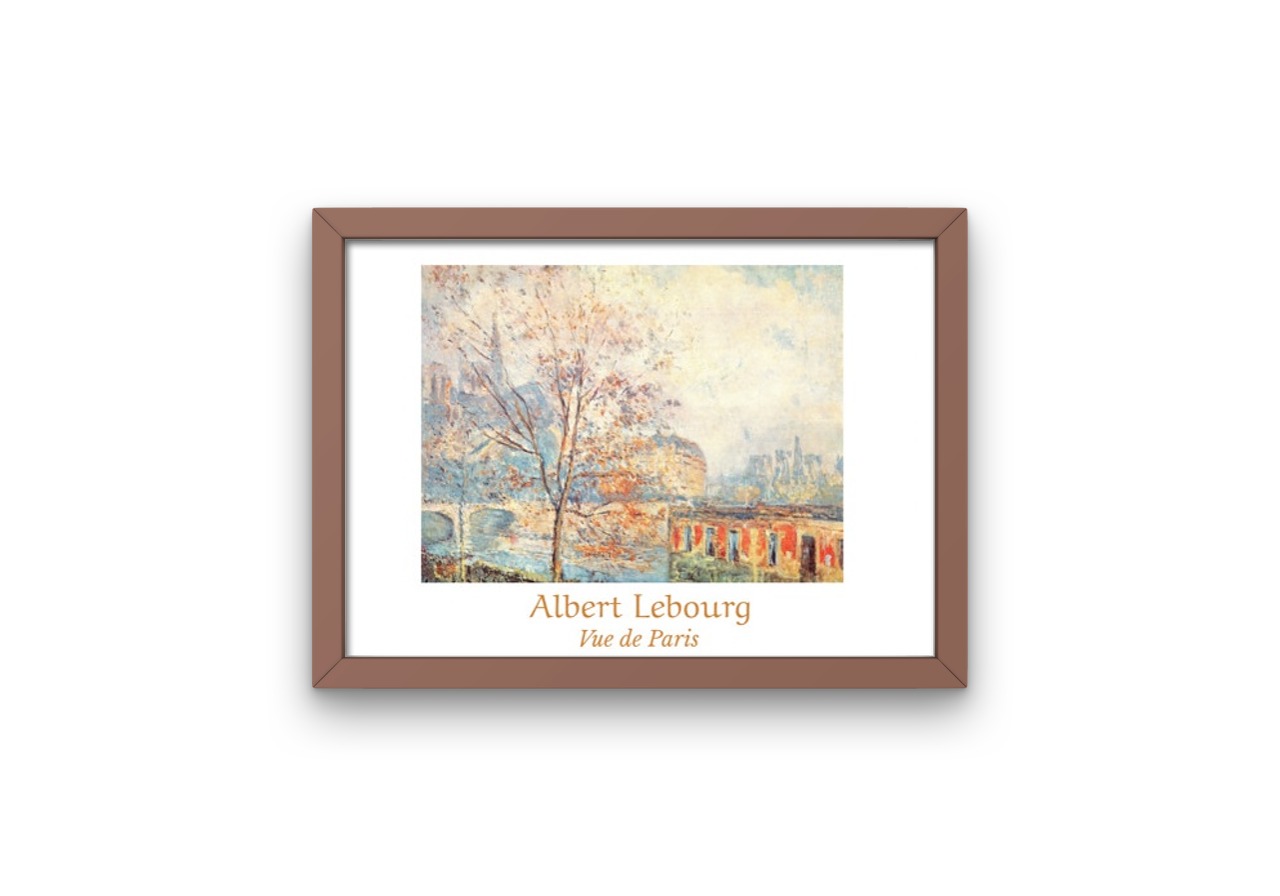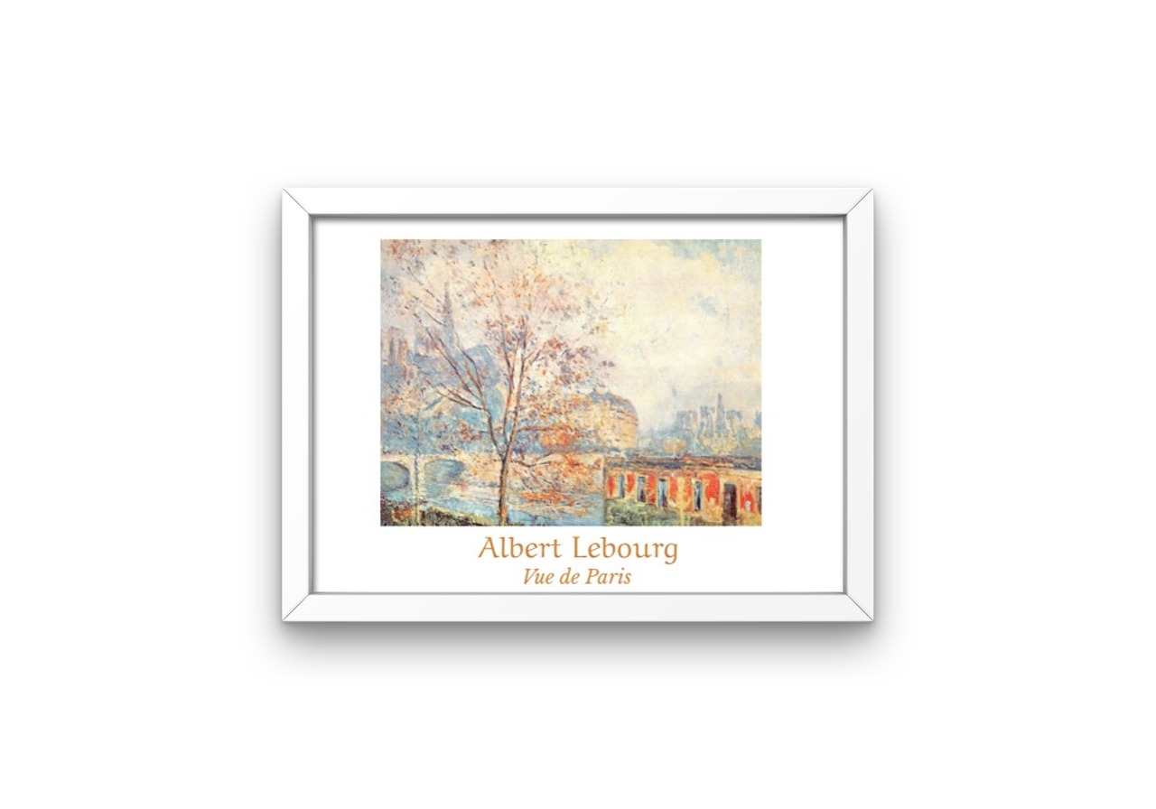 This luminous print was originally painted by Albert Lebourg, French impressionist artist, who was known for his beautiful landscapes. In this print, Lebourg has painted a view of Notre-Dame cathedral from the Quai Tournelle, overlooking the Seine river in Paris, in the dusky colours of autumn.