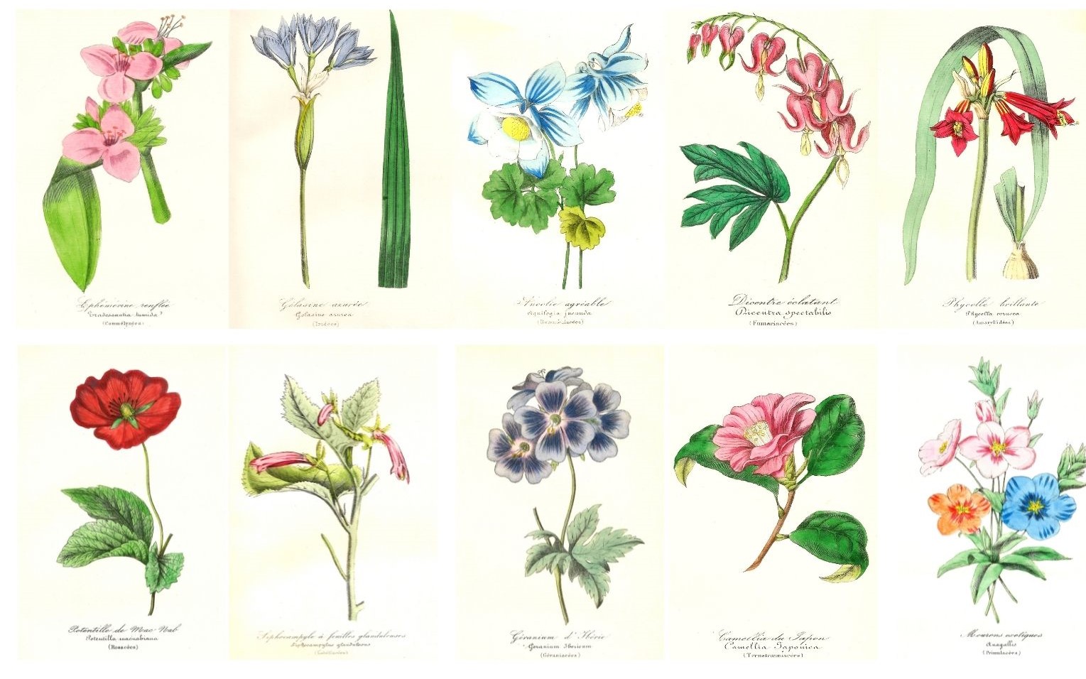 An exquisite collection of postcards, reprinted from original French flower illustrations. The flowers were illustrated by Emmanuel le Maout, French botanist, from his book Les Trois Règnes de la Nature, published in 1852.
