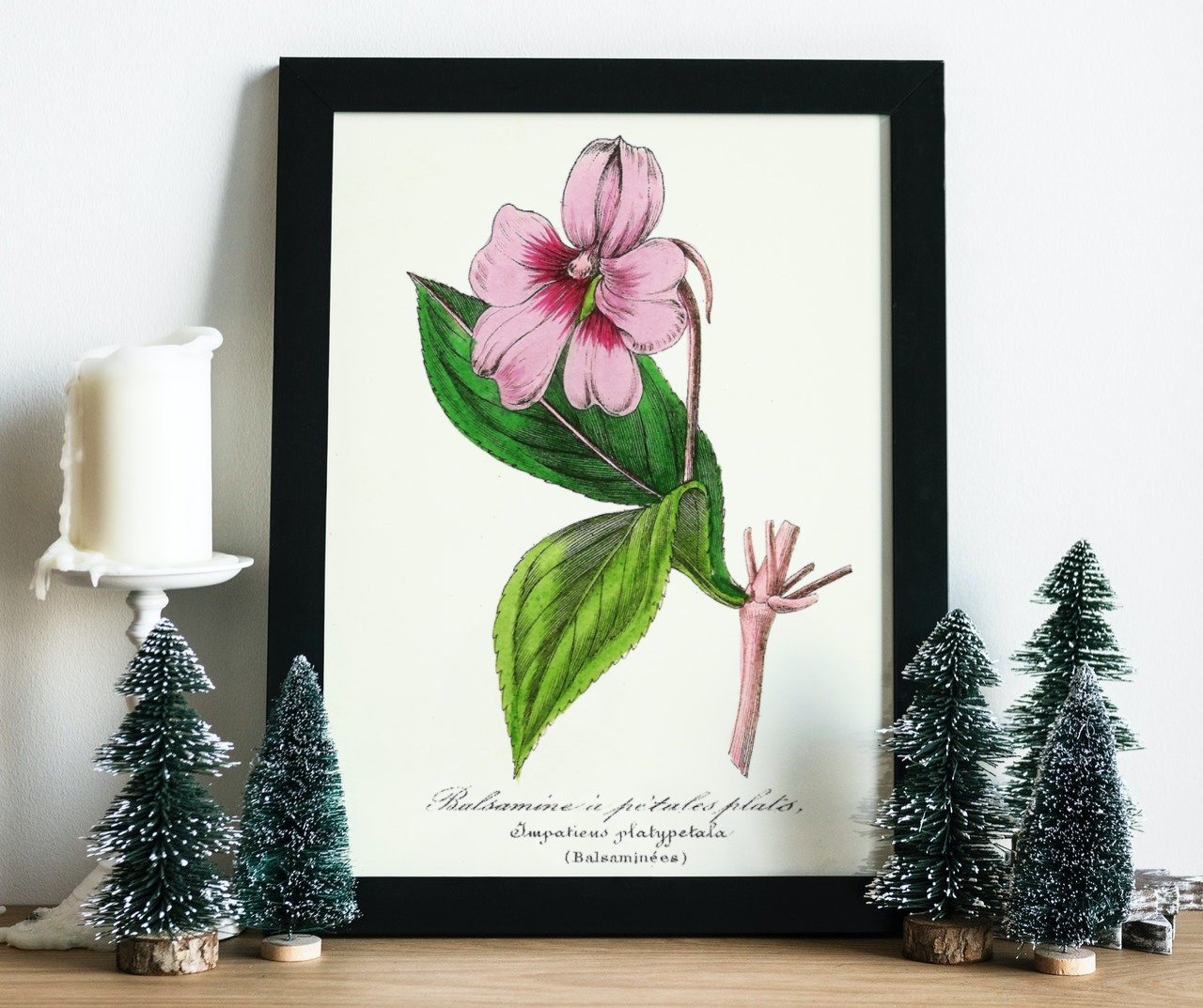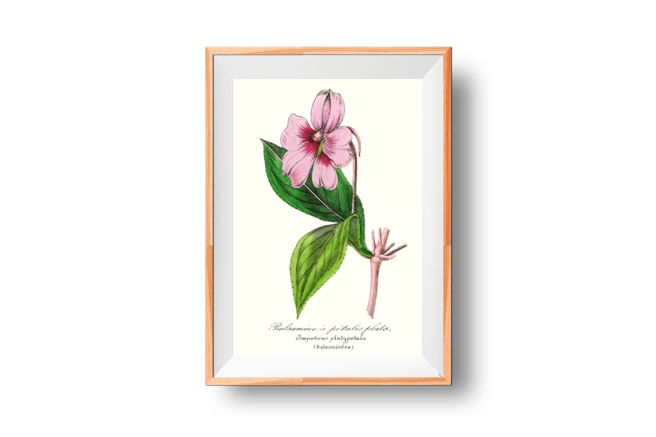 Title – Balsamine à petales plats, Impatiens, 1852, French flower illustration, Le Maout botanical print