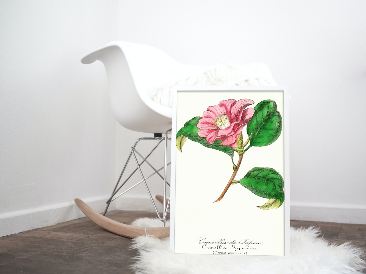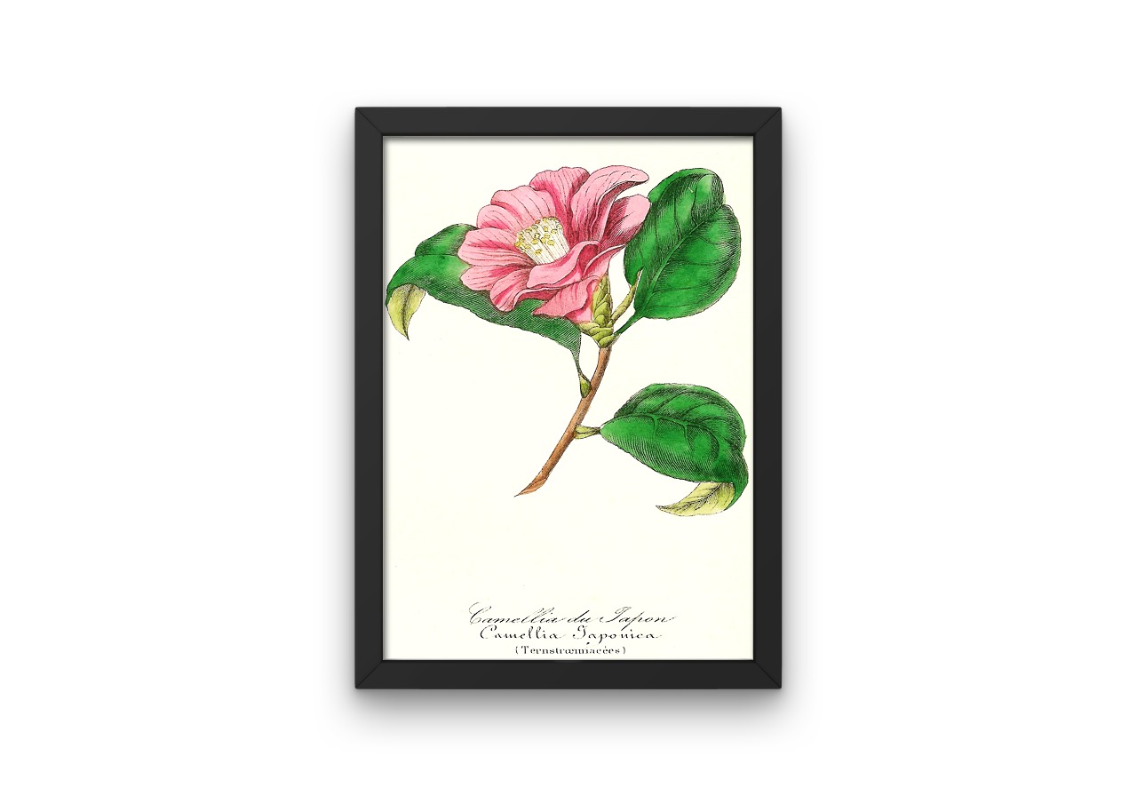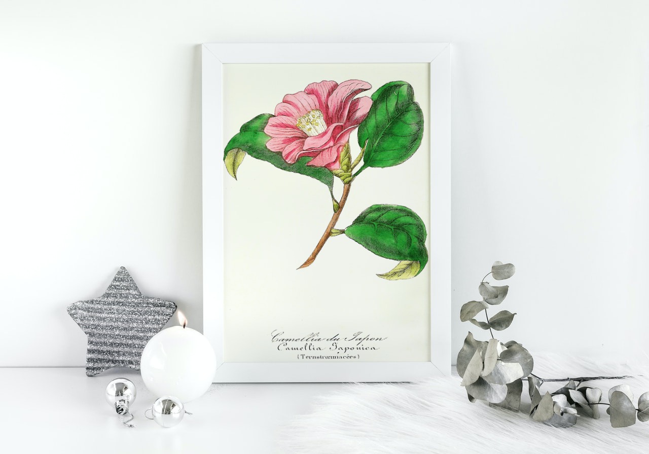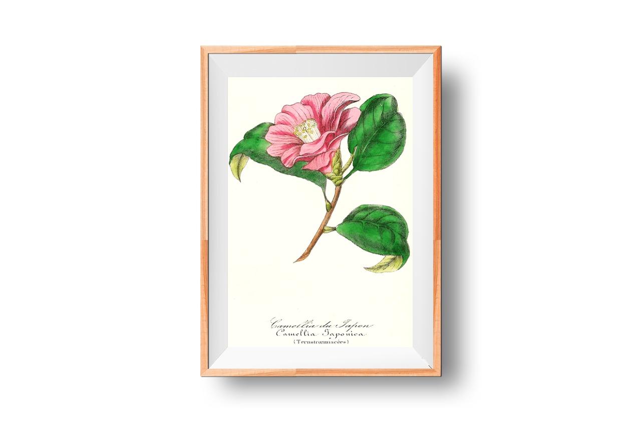 Camellia du Japon Botanical print by Emmanuel le Maout, French botanist, from the book Les Trois Règnes de la Nature, published in 1852.
