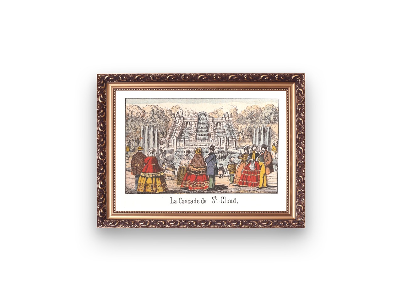 This print is one in a series of Epinal images from the mid 1800s showing different parts of Paris. The Cascade de St Cloud was once in the grounds of the Château St Cloud, not too far from Paris, which was purchased by Marie Antoinette for herself and her children. Napoléon Bonaparte also stayed here when he was Emperor, but the beautiful château was destroyed during the Franco-Prussian war of 1870. The Cascade is one of the few surviving structures from the grounds.