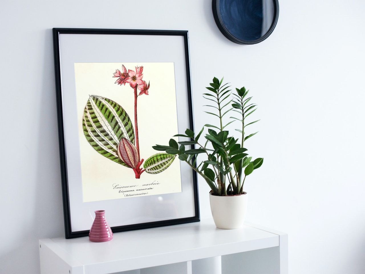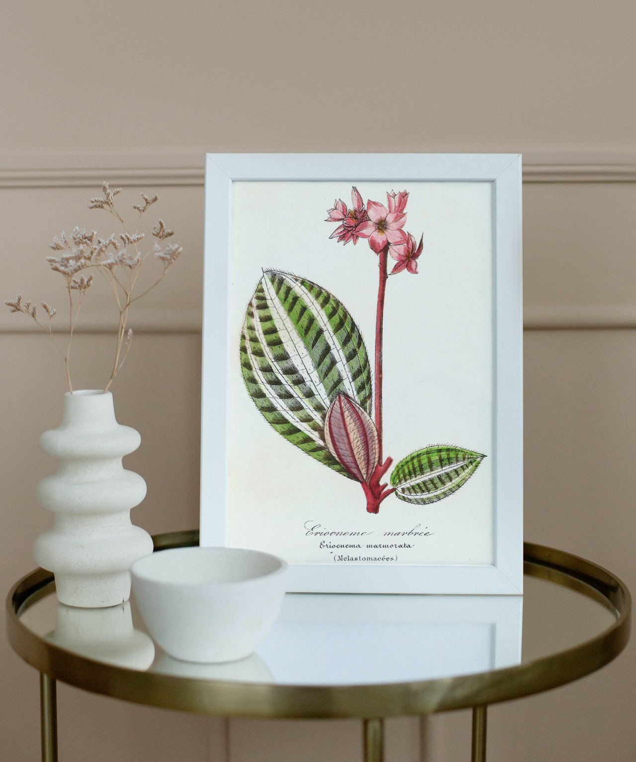 The name of this unusual flower is Eriocneme Marbrée, a beautiful botanical print by Emmanuel le Maout, French botanist, from the book Les Trois Règnes de la Nature, published in 1852.