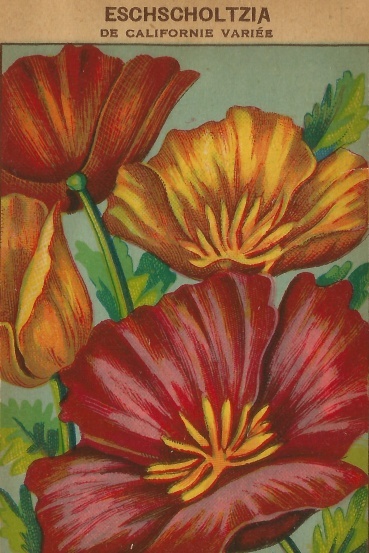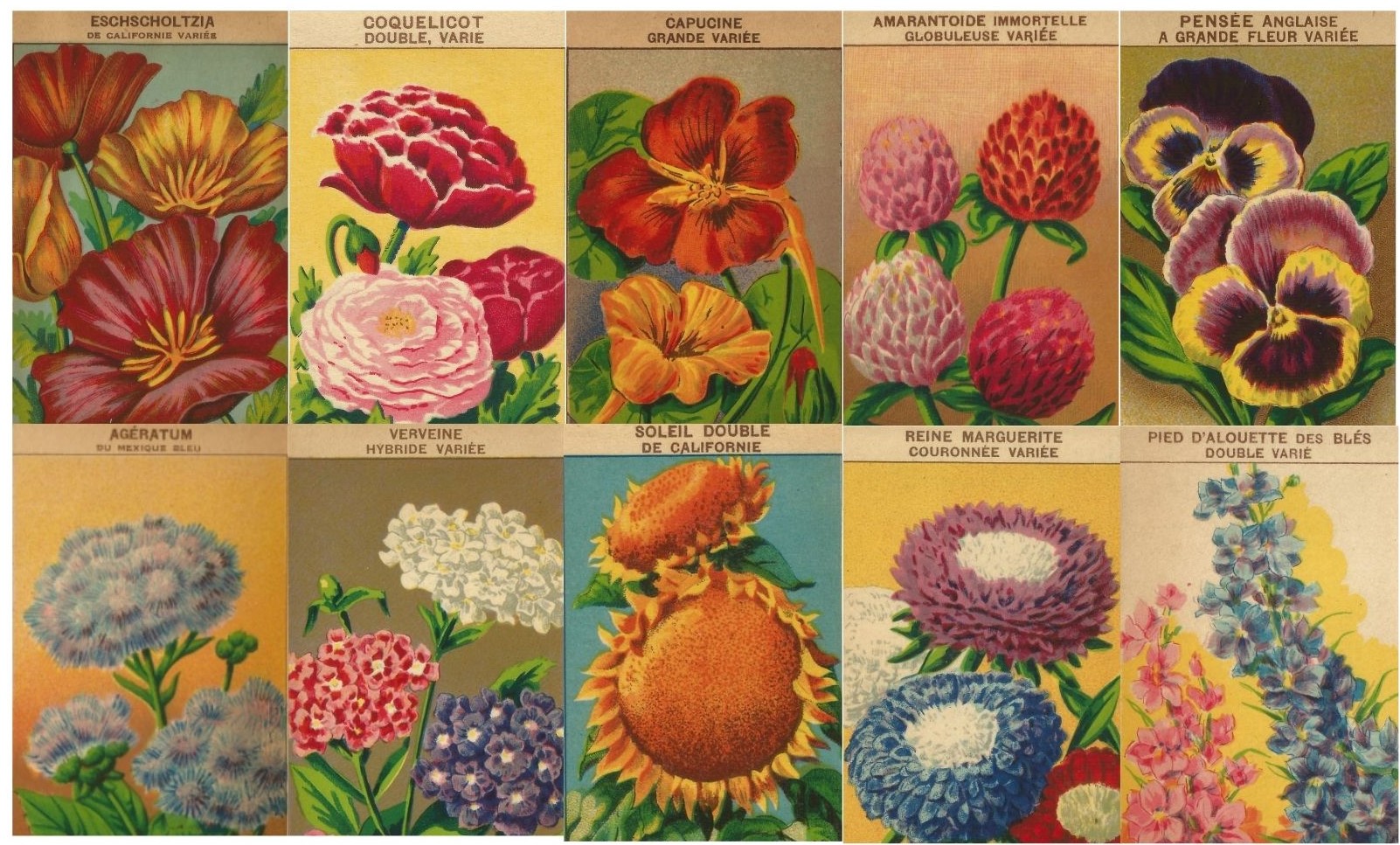 Pied d’Alouette des Blés, Verveine, Reine Marguerite, Ageratum, Amarantoide Immortelle, Capucine, Coquelicot, Pensée Anglaise, Eschscholtzia, Soleil de Californie.