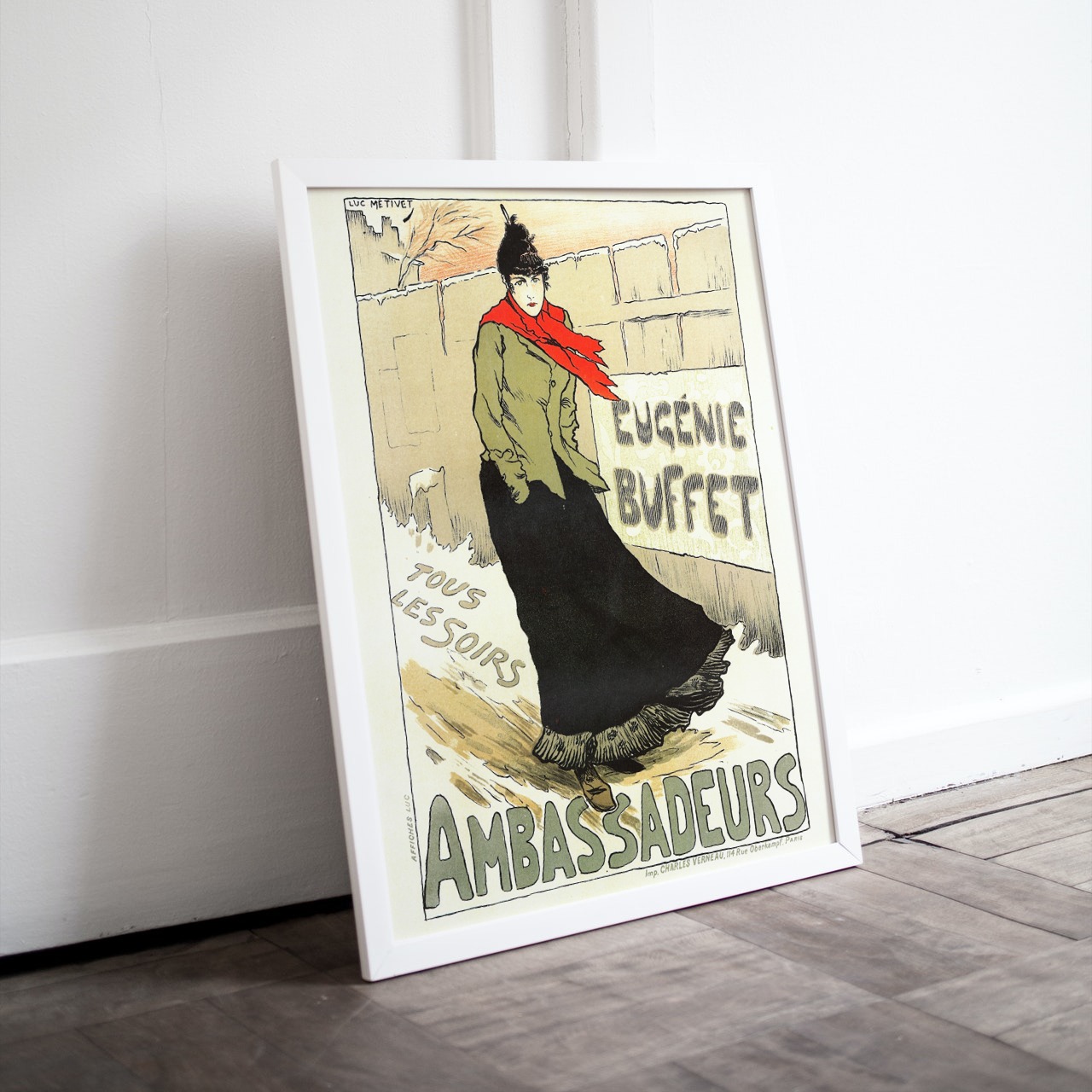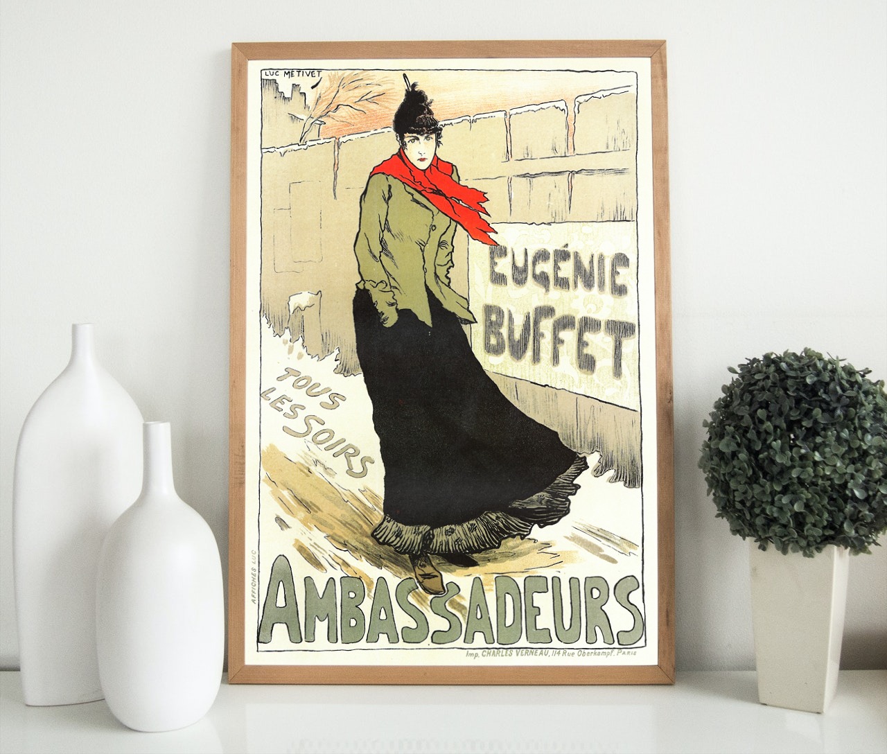 This listing is for an 1896 Art Nouveau print. Eugénie Buffet was a beloved French singer from the 19th century, performing in fashionable cafes and restaurants in Paris. This particular poster is advertising for her performance at the restaurant Les Ambassadeurs in 1896, painted by artist Lucien Métivet.