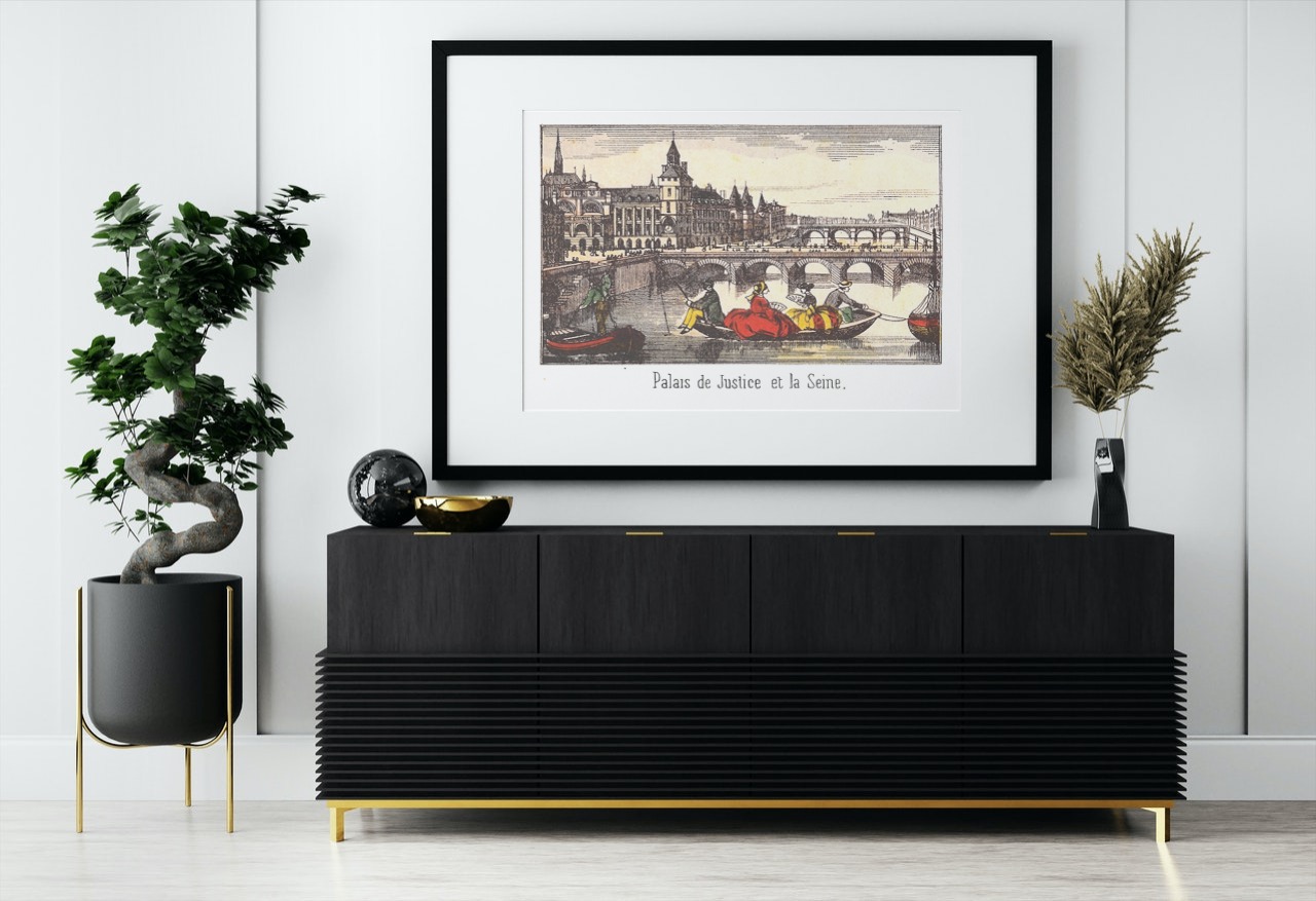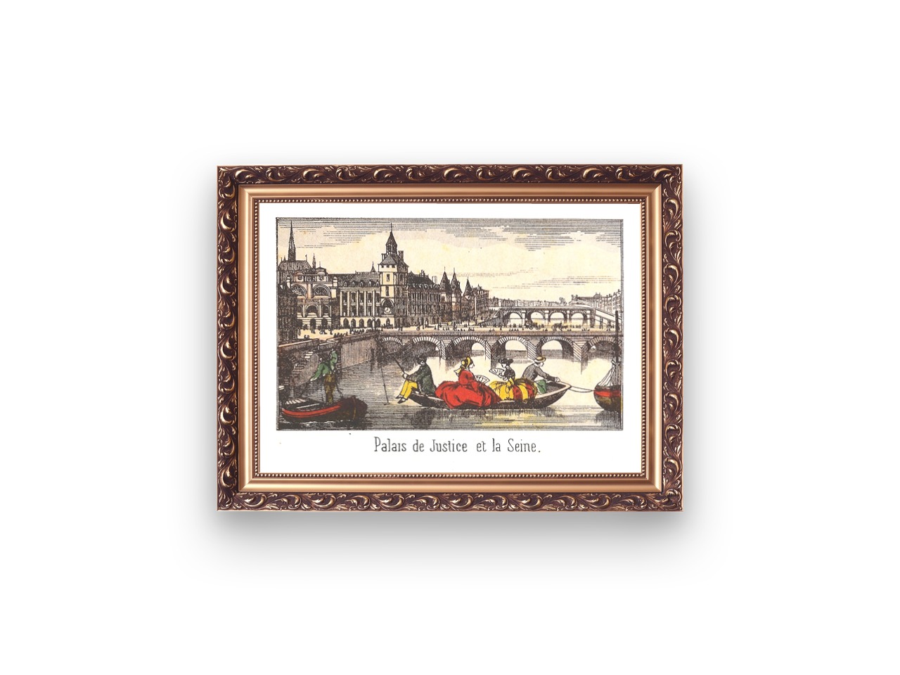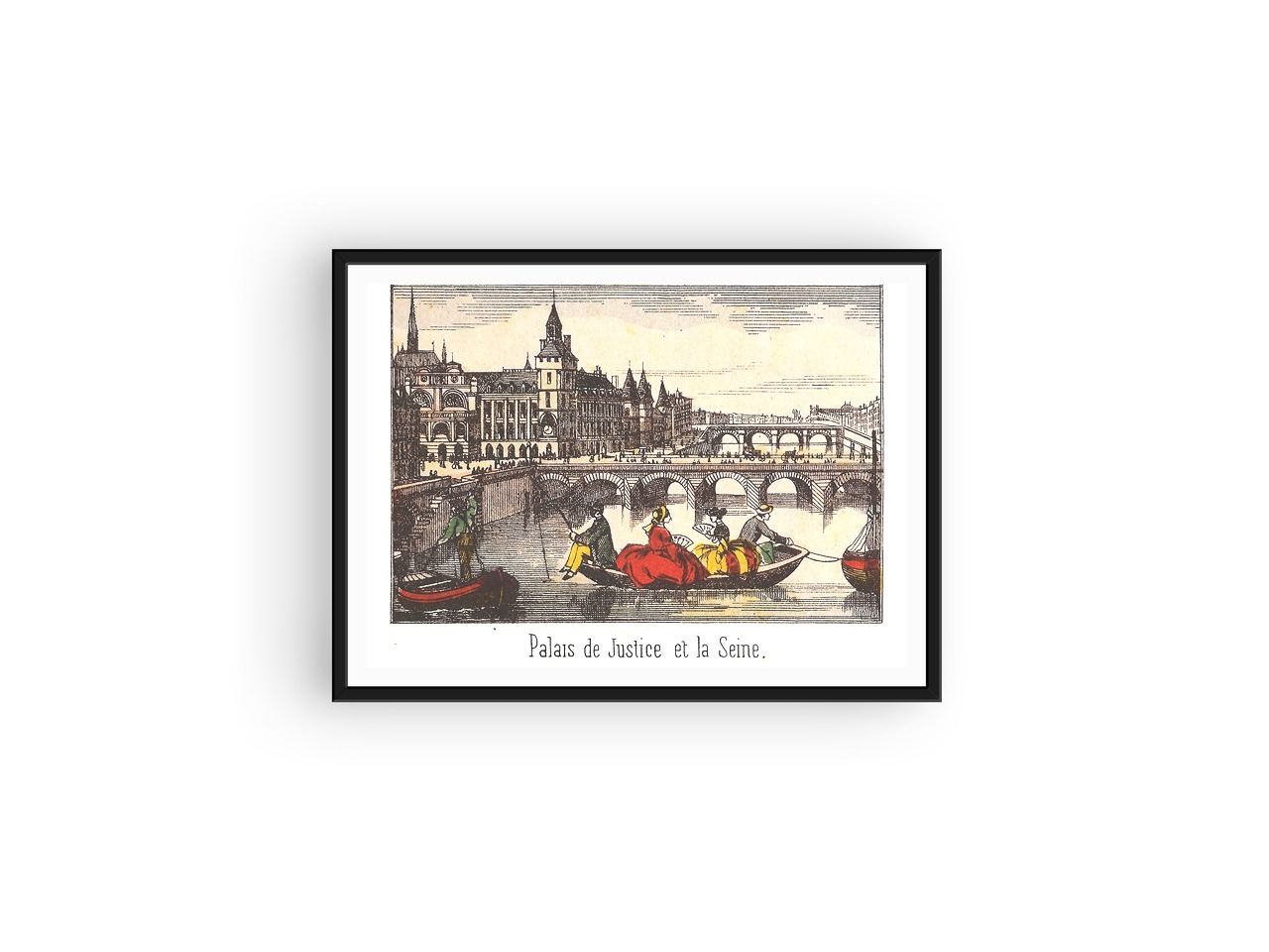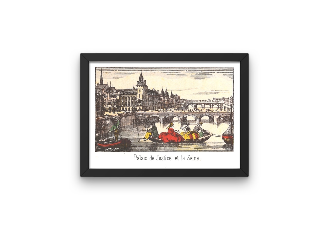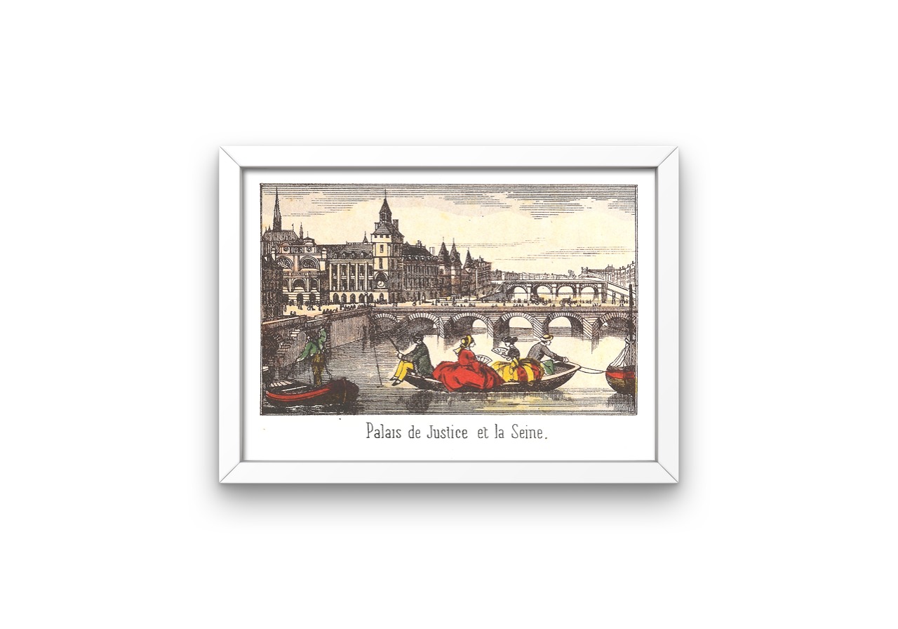 This print is one in a series of Epinal images from the mid 1800s showing different parts of Paris. The Palais de Justice is to be found on the Île de la Cité , and used to be the home of ancient kings and queens of France. In the image can be seen the Conciergerie, which is the prison where Marie Antoinette was held before her execution.