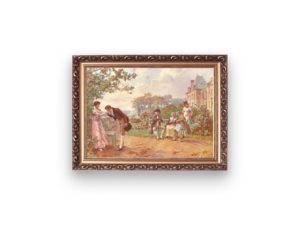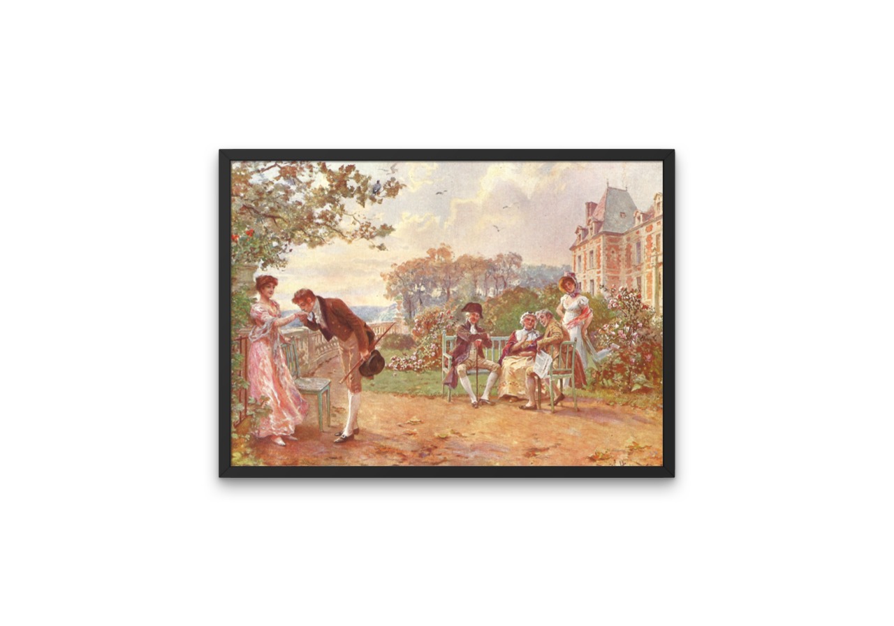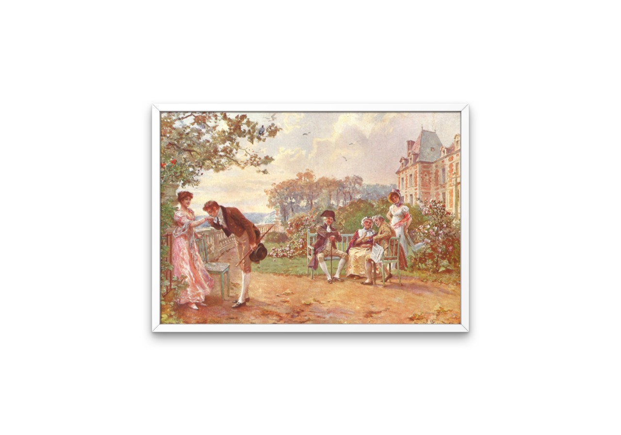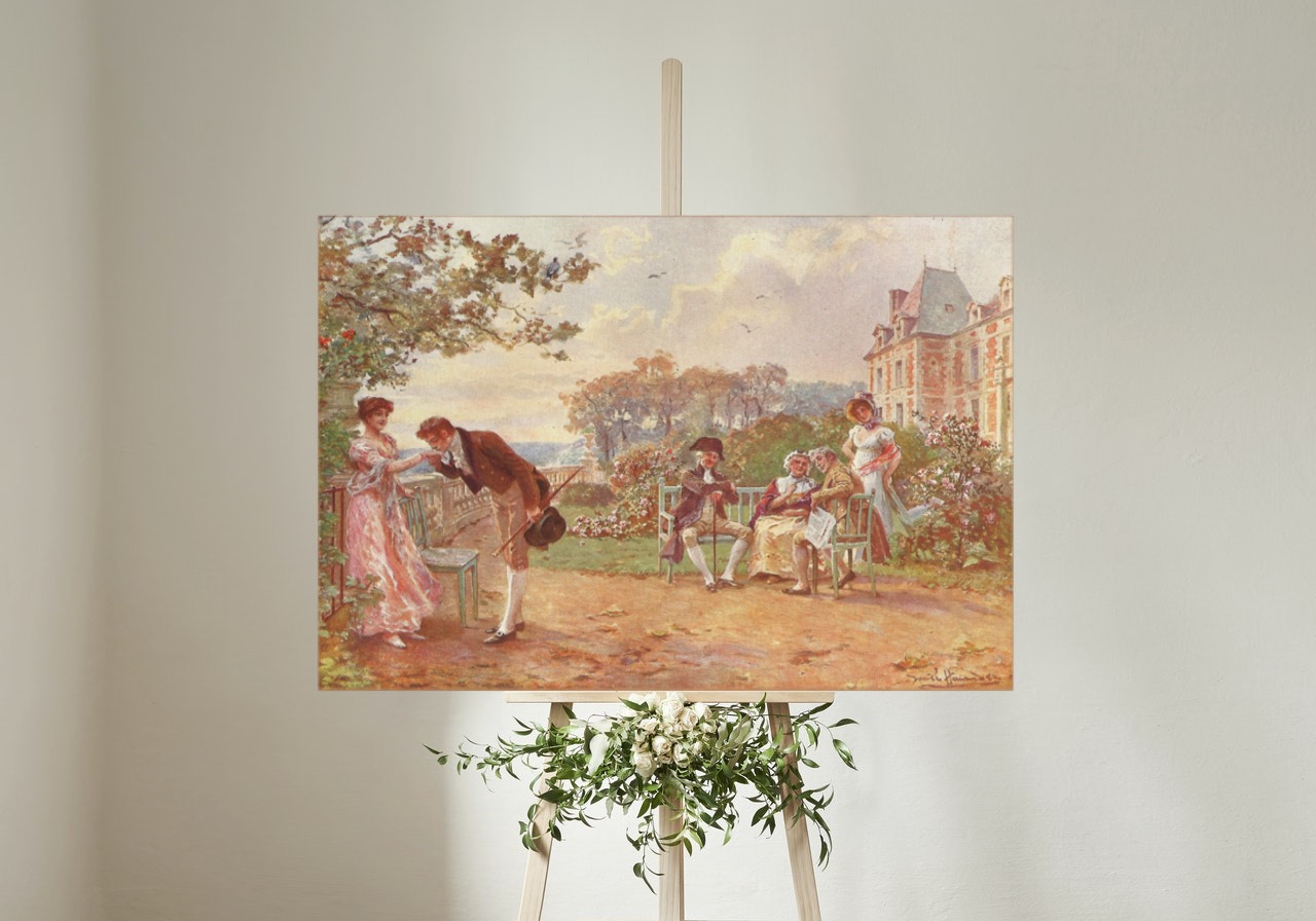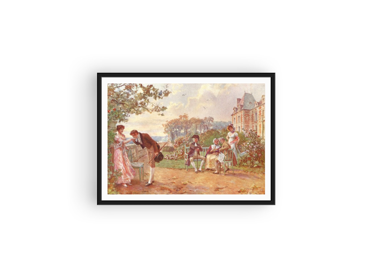 This print is taken from a 1901 fashion catalogue. The fashion house, High Life Tailor, published beautiful works about the history of fashion, as a means to advertise their own stylish designs. This is the first print in the series which tell the story of the romance of the main couple, from falling in love at first sight in the grounds of the château, to marriage and a happy life, and eventually being presented to the Emperor Napoléon and Empress Josephine. It’s a very romantic story.