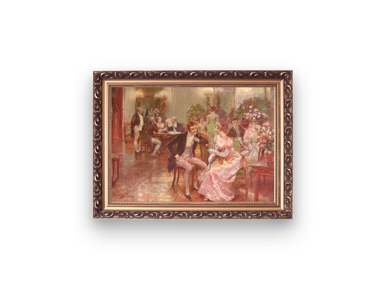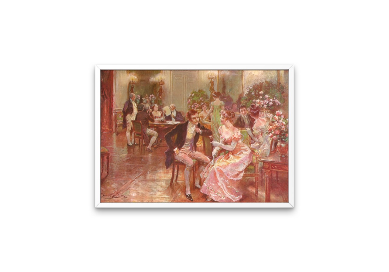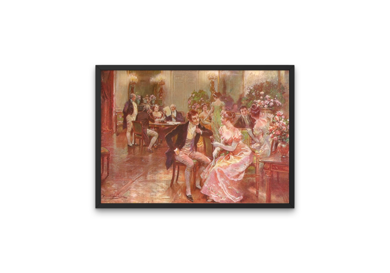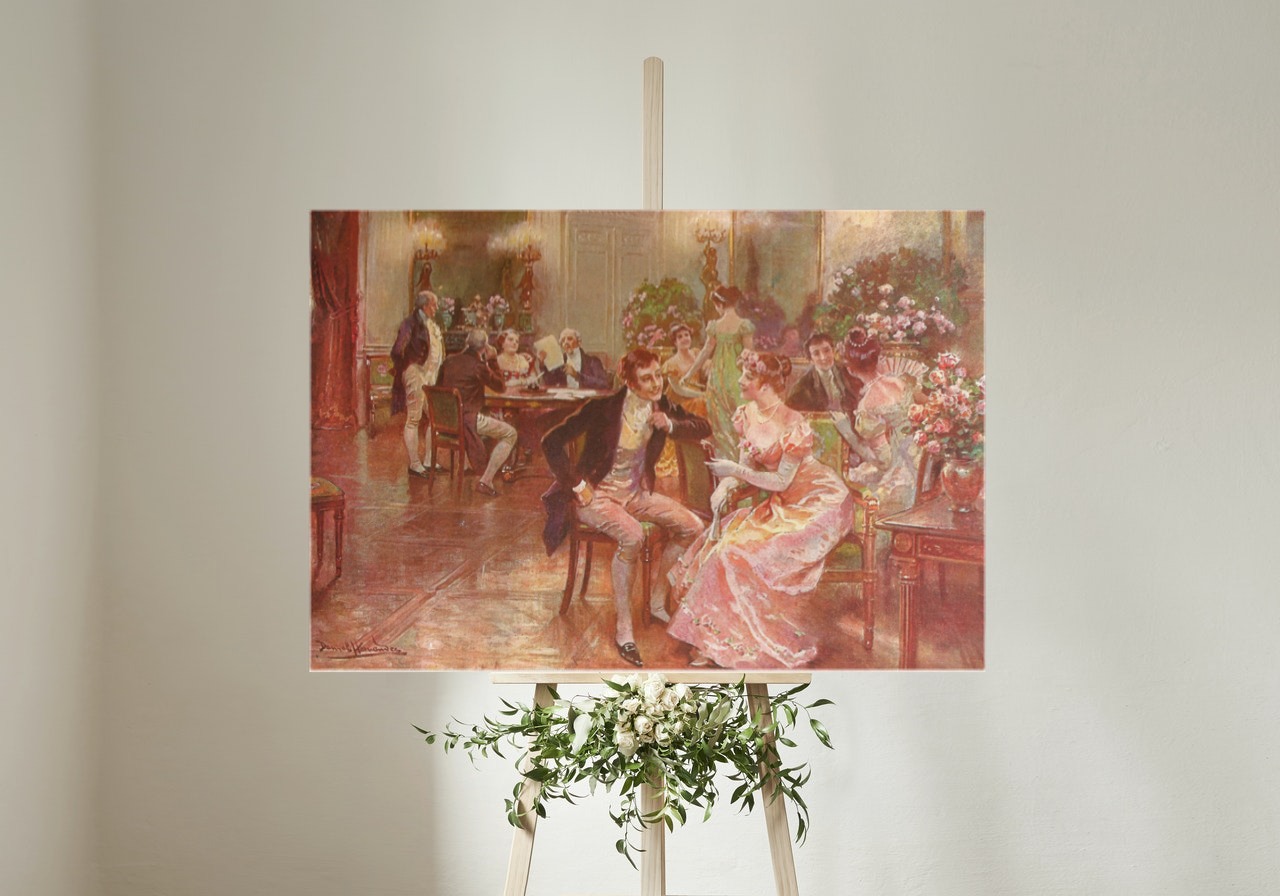 This print is taken from a 1901 fashion catalogue. The fashion house, High Life Tailor, published beautiful works about the history of fashion, as a means to advertise their own stylish designs. This is the second print in the series which tell the story of the romance of the main couple, from falling in love at first sight in the grounds of the château, to marriage and a happy life, and eventually being presented to the Emperor Napoléon and Empress Josephine. It’s a very romantic story.