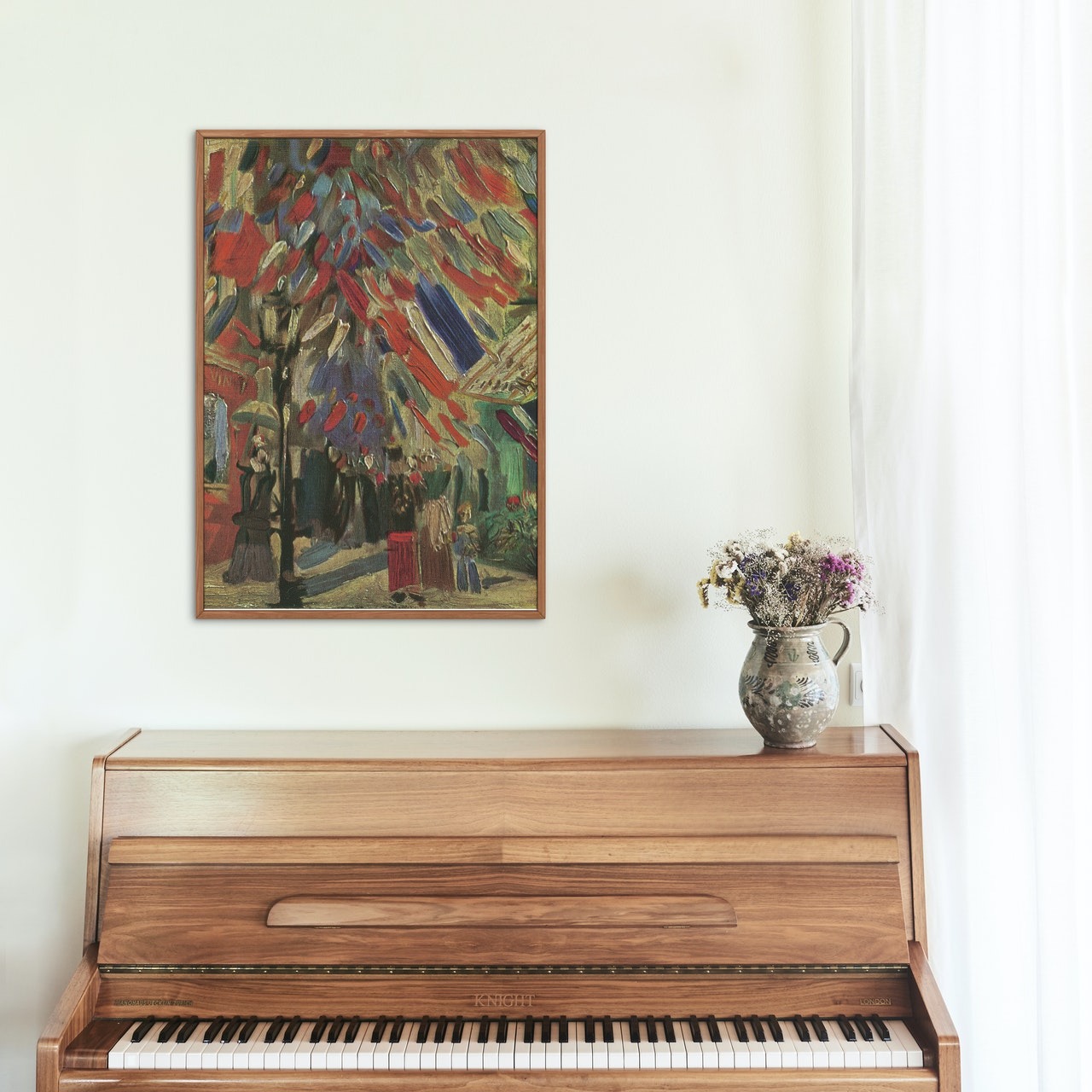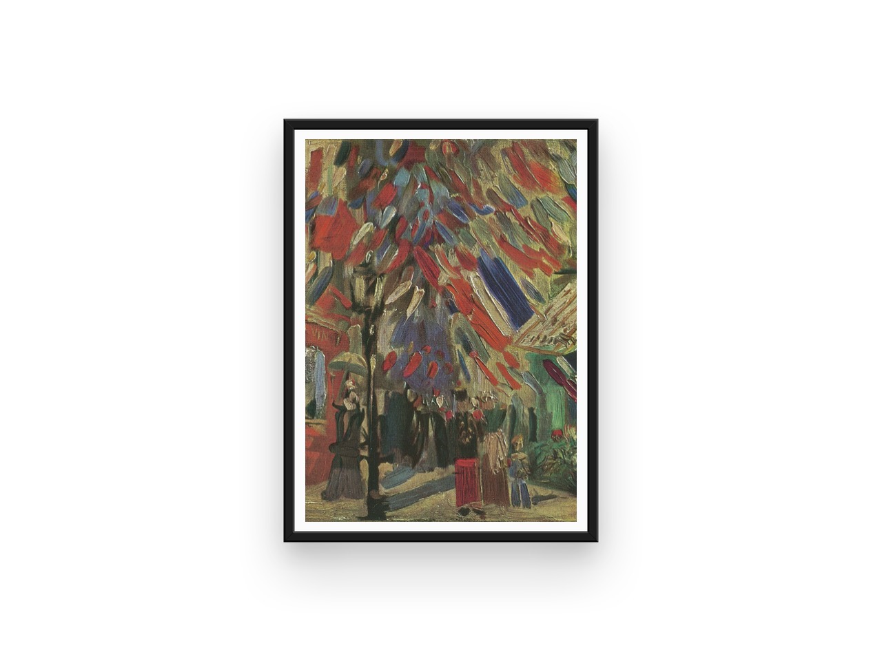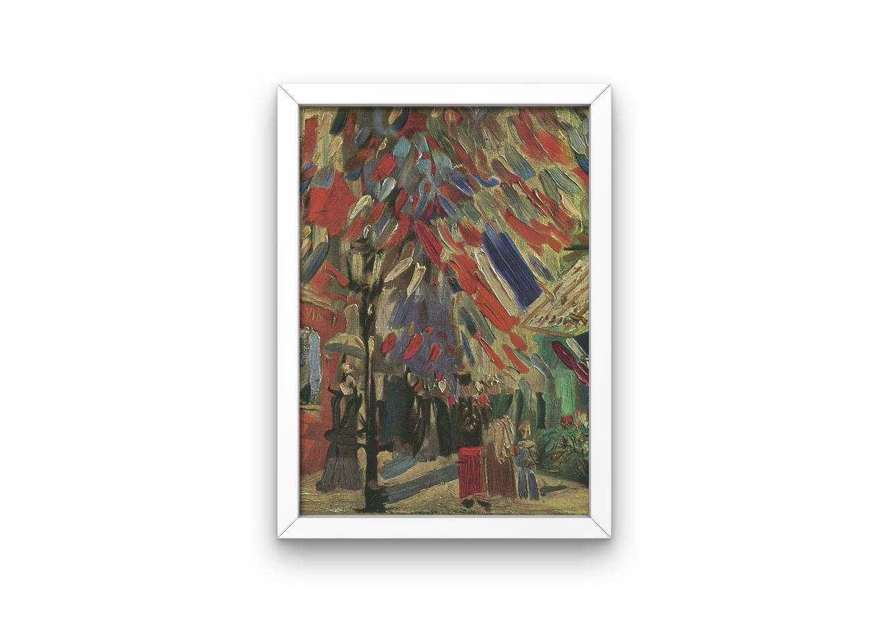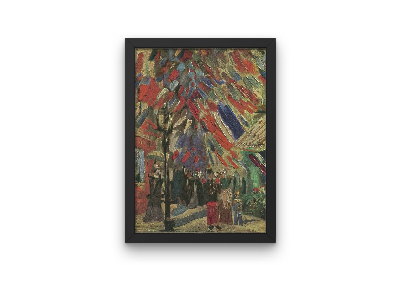 This listing is for a print titled Le 14 juillet, painted in 1886 by Vincent Van Gogh. The street had been decorated for 14 Juillet (National Day or Bastille Day in France). Van Gogh is a famous impressionist French artist but some of his work is considered to be part of the art movement known as ‘fauvism’, as these post-impressionist artists were considered to be ‘fauves’ (wild beasts) by art critics.