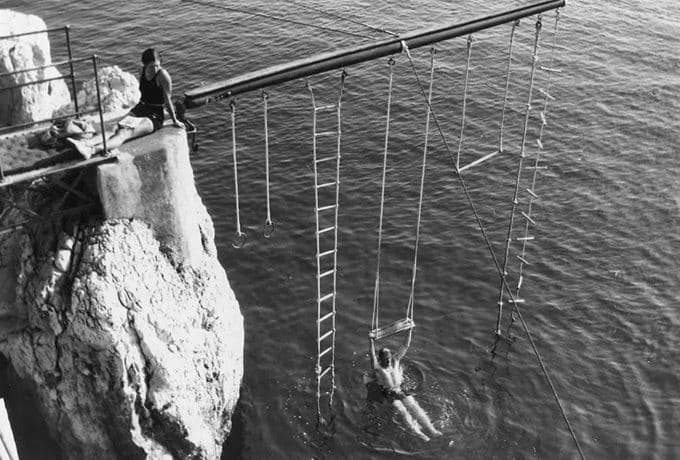 The haunt of American movie stars and the English aristocracy, the sea pavillon of Eden Roc, part of the luxurious Hotel du Cap d’Antibes, was the place to see and to be seen. In his short story “The Three Fat Women of Antibes,” Somerset Maugham writes that the Eden Roc bar was known to everyone as the Monkey House since it was always “crowded with chattering people in bathing costumes, pyjamas, or dressing gowns.” According to French journalist Albert Flament, these were crazy times around the swimming pool, which had been hewn into the rocks in 1929: