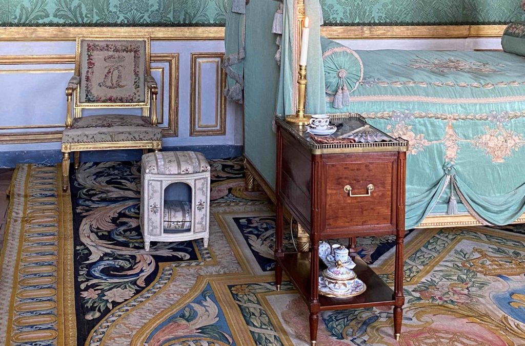 But it was a bedroom all the same, and the objects on display give a glimpse into the world of Madame Thierry. On the bedside table, if you look closely, you can see the treasured fan which was a gift from the queen Marie Antoinette. Perhaps she soothed a crying grandchild in the chair next to the bed, took tea next to the fireplace protected by its silk firescreen, or played a game and gossiped with a close friend whilst sitting at the small table on green damask chairs. Letters were written in the small library which adjoined her room, overlooking the colonnaded terrace, with her armchairs painted white and upholstered in toile de Jouey. It seems like a happy place.
