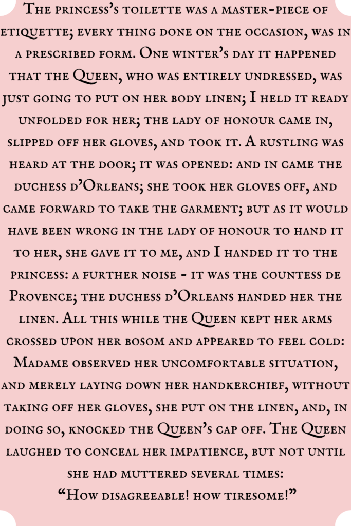 Marie-Antoinette had been a royal all her life; she knew about court etiquette, how to be on public display. But nothing prepared her for life in the royal court of Versailles, with its traditions and rituals, and nobles and courtiers maneuvering and scheming for personal gain. Even more complicated, however, was the simple act of getting dressed.